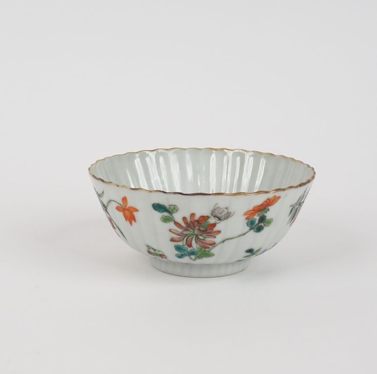 Chine, époque Tongzhi (1861-1875) Couple floriforme à panse côtelée, godronnée en porcelaine et émaux polychromes à décor de fleurs. Marque Tongzhi sous la base. D. 5,5 x 13,5 cm