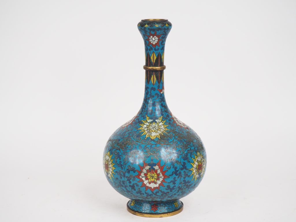 Chine, fin XIXe siècle début XXème siècle Vase bouteille à col bulbeux en bronze et émaux cloisonnés à décor de fleurs de lotus et rinceaux feuillagés sur fond turquoise. Marque apocryphe Ming sous la base. Sauts d’émail et petits manques. H.41 cm