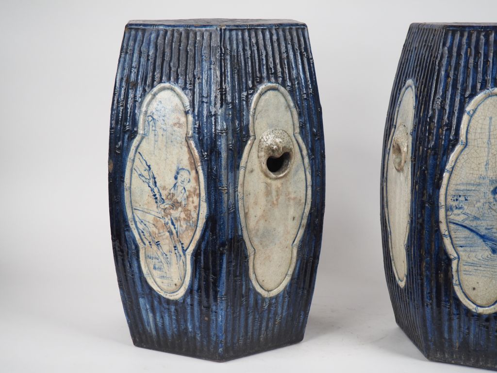 Chine, fin XIXe siècle, Paire de tabourets en porcelaine émaillée bleu reprenant la forme de branches de bambou à décor en médaillons floriformes de jeunes femmes et végétaux. H.47,5 cm
