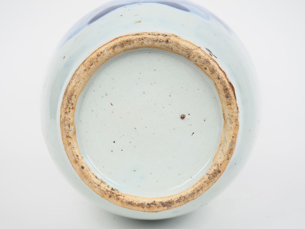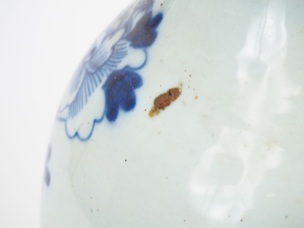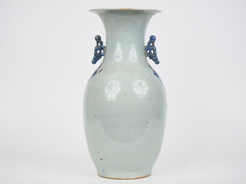 Chine, fin XIXe siècle, Vase balustre en porcelaine bleu blanc, à décor de fleurs de prunus, pivoines et échassier. Les anses en forme de feuillages stylisés. H. 42 cm