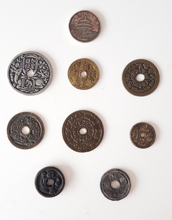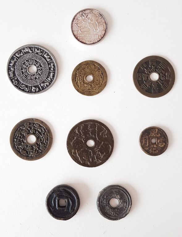 Chine Lot de neuf pièces en alliages de cuivre et une en argent, comprenant : . Pièce de 10 yuan en argent frappée d’un panda et du temple du ciel, datée 1989 , . Six sapèques taoistes percées en leur centre, dont trois à décor des Bagua et trois à décor des douze signes du zodiaque , . Deux pièces à décor illisible. Diam. 3 cm à 5,5 cm
