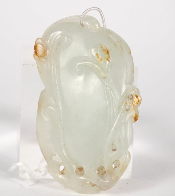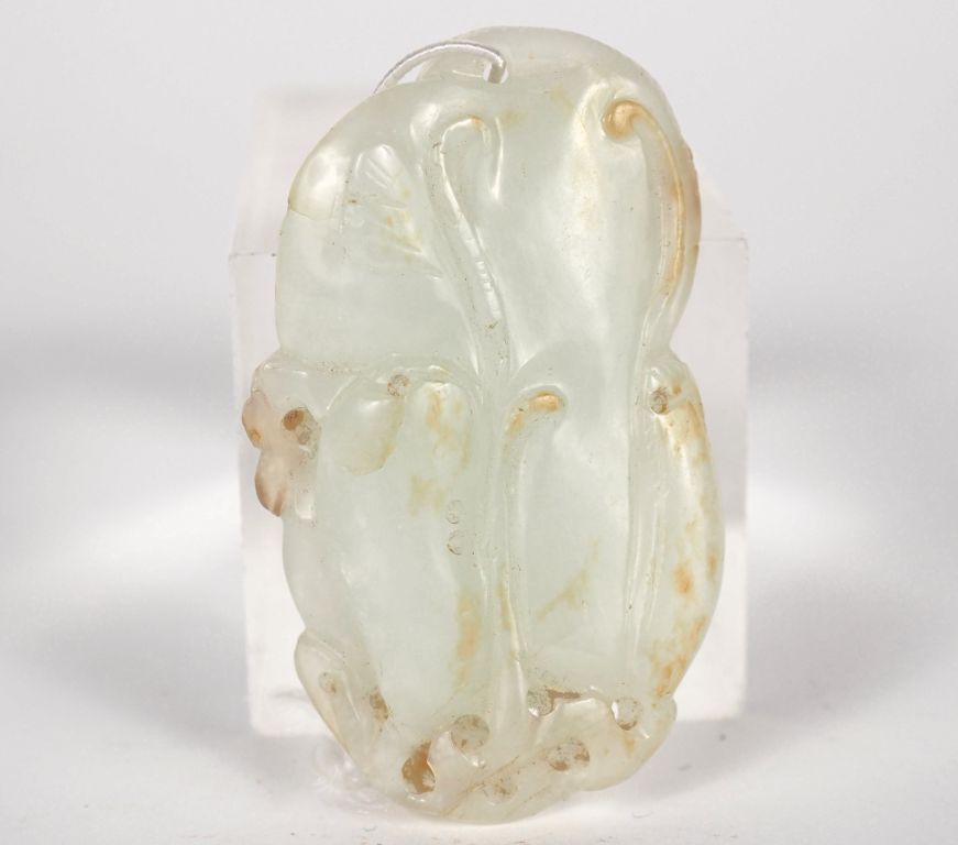 Chine, période Jiaqing Pendentif en jade céladon légèrement infusé de rouille, représentant des aubergines. H. 5,8 cm