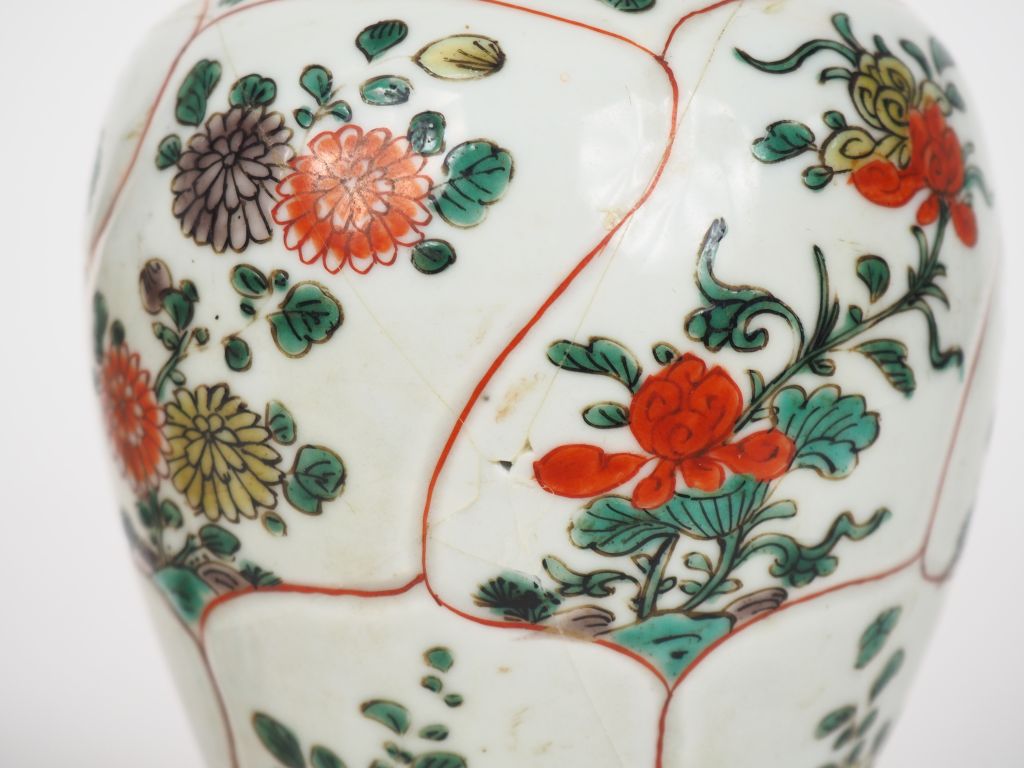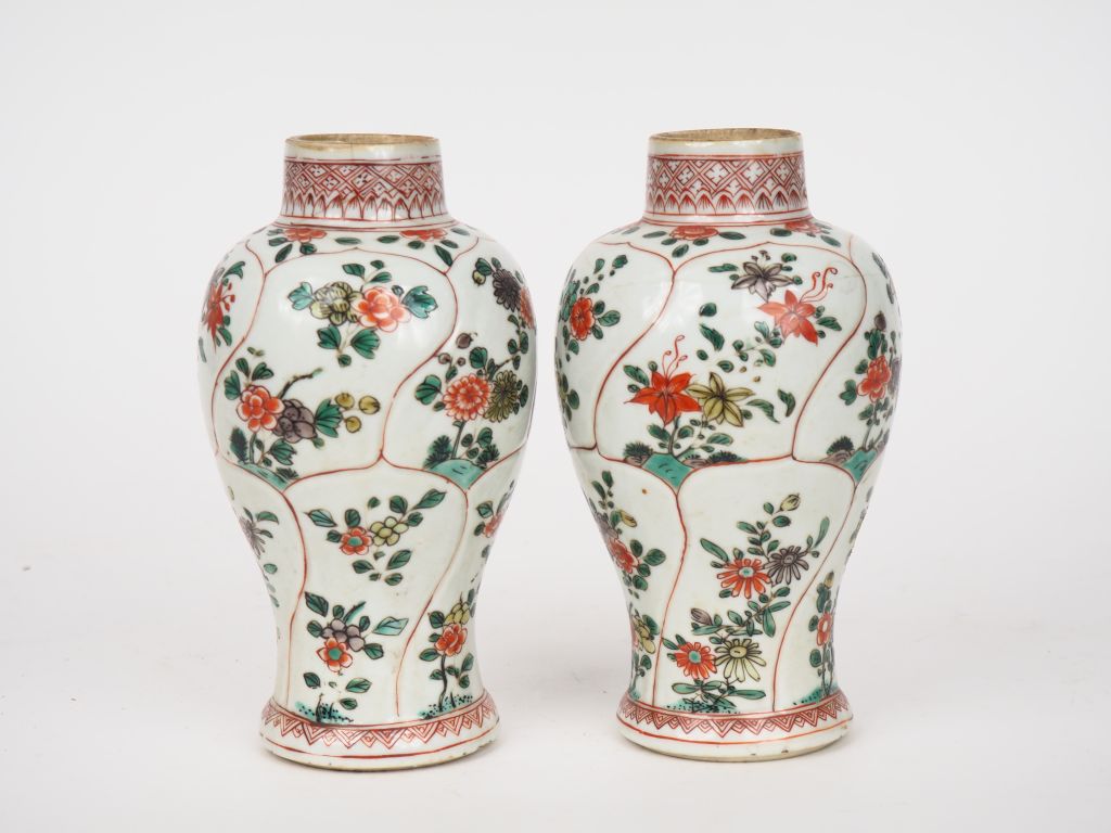 Chine période kangxi. XVIIIème siècle Paire de vases en porclaine émaux famille verte décor de compositions florales limitées par des pétales en léger relief. H. 18,5 cm (petit fel sur le col de l'un, fels sur l'autre vase, manque les couvercles)
