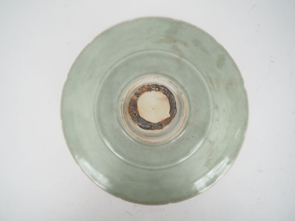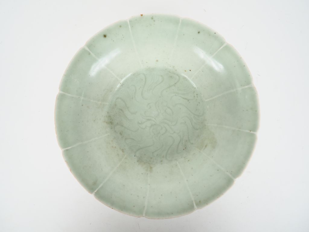 Chine période Qing dans le goût de Song. Coupe floriforme en porcelaine et émail de type céladon à décor d'une fleur de lotus incisée sous couvert. Diam. 22,7 cm.