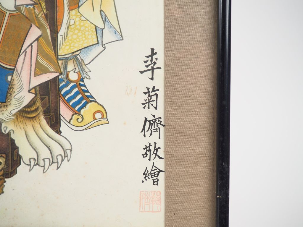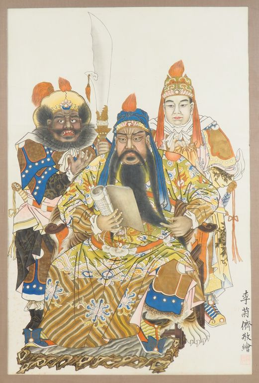 Chine, période République, Encre et couleurs sur papier, représentant la légende des trois Royaumes, au travers des trois personnages que sont Liu Bei, Zhang Fei et Guan yu. Signée en bas à droite Li Juchai, peintre pékinois actif à la fin de la dynastie Qing début République, connu pour ses représentations de personnages de romans ou des opéras. Encadrée sous verre Dim à vue. 74,5 x 49,5 cm