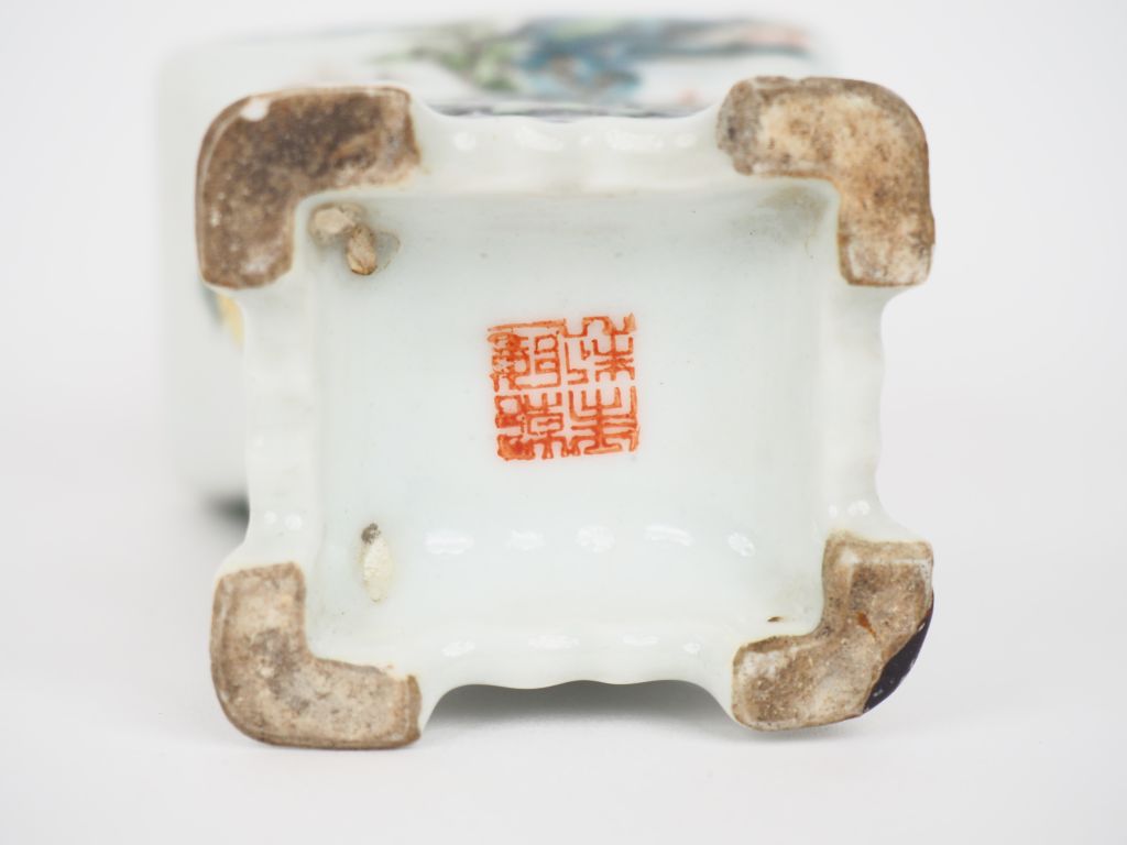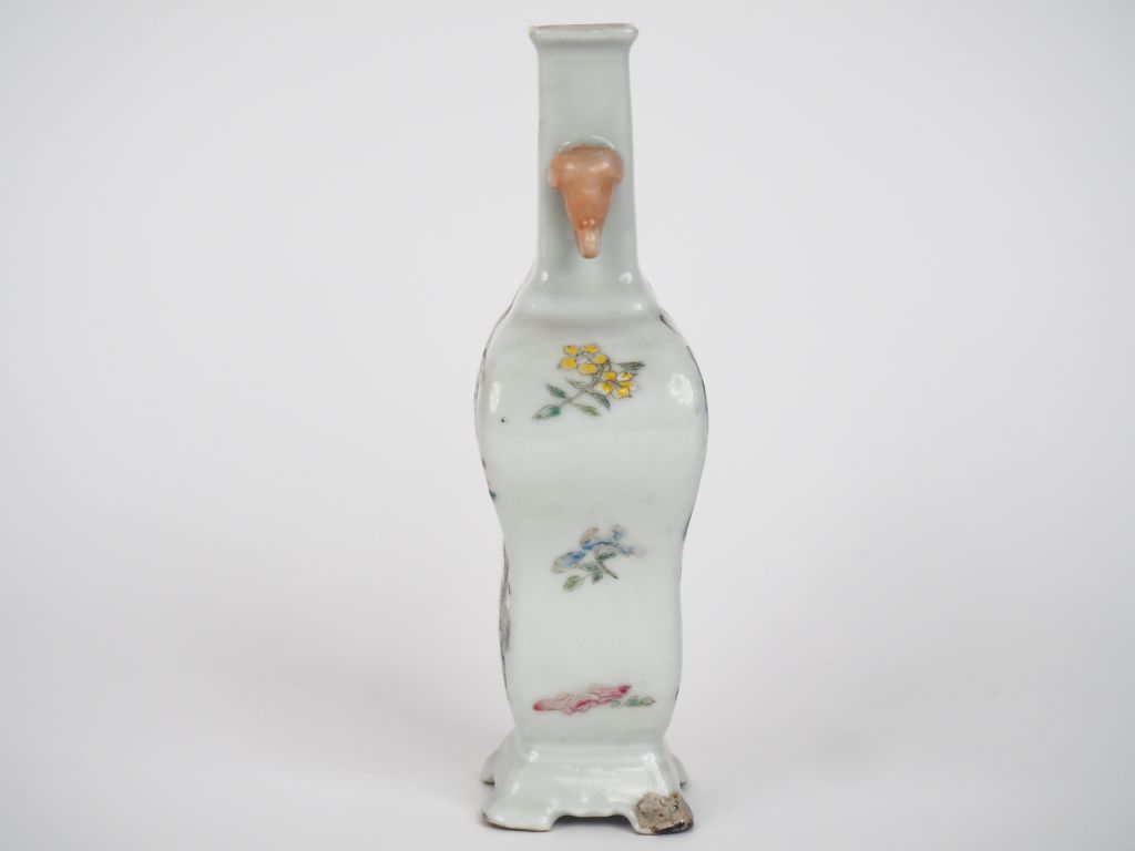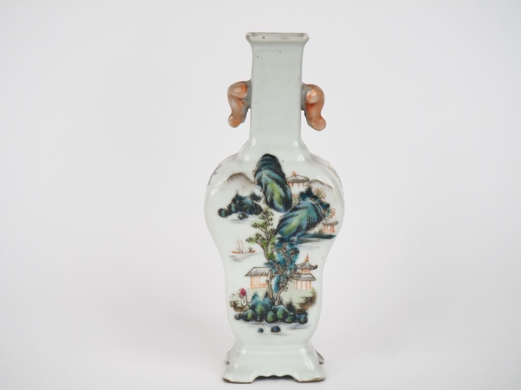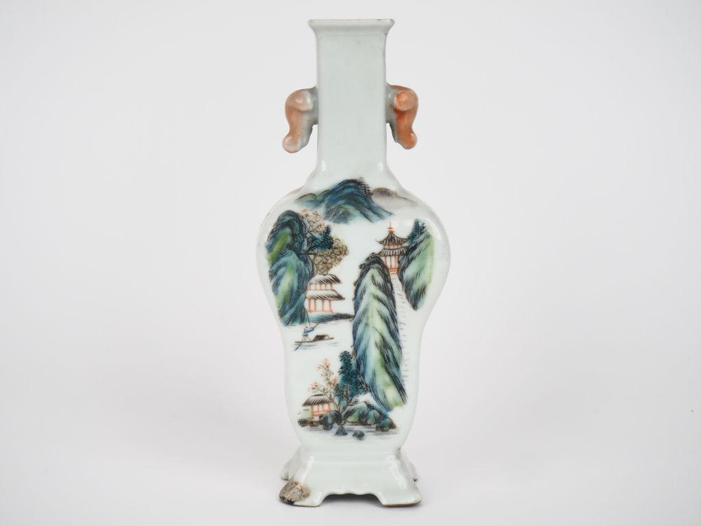 Chine, première république, Vase balustre à panse large et long col quadrangulaire en porcelaine et émaux polychrome d’une cité lacustre, oiseaux et fleurs. Deux têtes d’éléphants formant anses. Marque apocryphe Qianlong sur la base. H. 18 cm (petite rayure d'émail, une petite égrenure au col, un pied restauré).