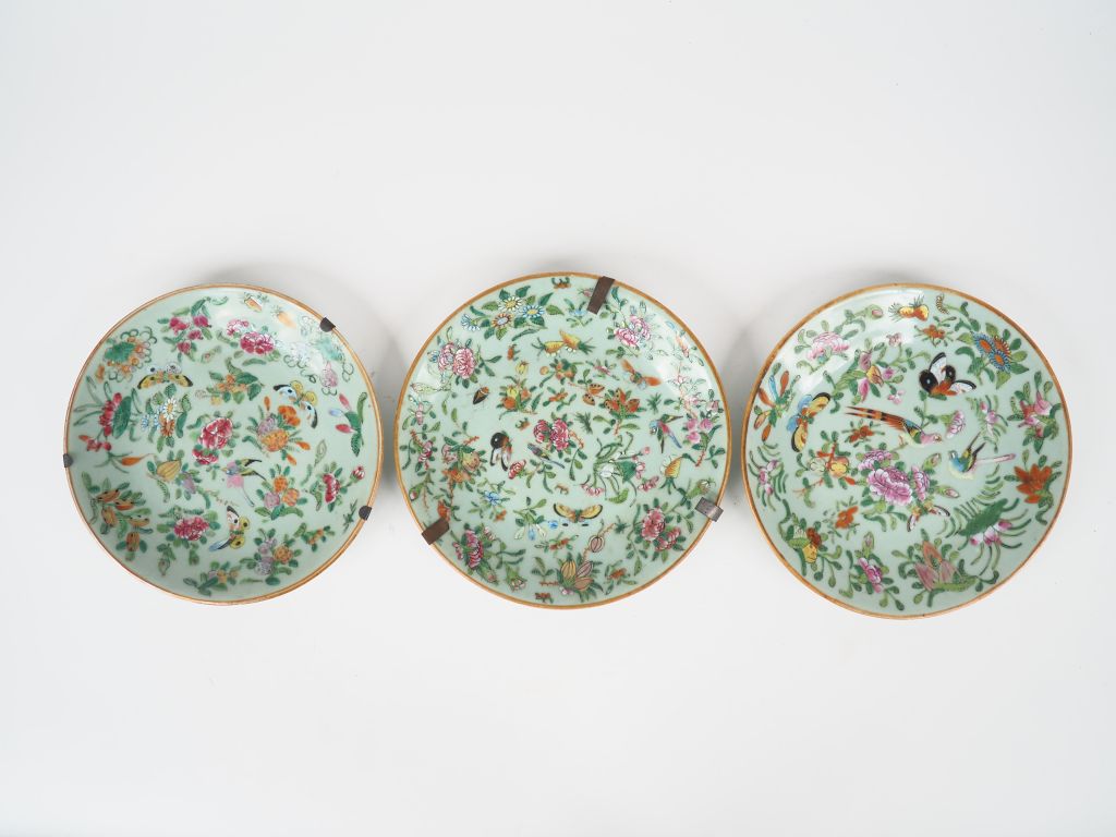 Chine vers 1900. 3 assiettes en porcelaine et émaux de style famille rose reposant sur un fond céladon à décor de faisans, de papillons, de divers volatiles et de branchages fleuris. Diam. 25 cm