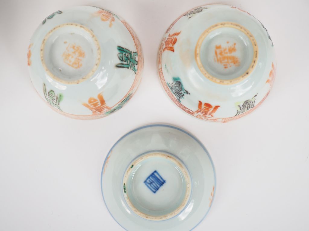 Chine, vers 1900, Deux coupes à alcool, une coupe et présentoir, un bol en porcelaine, famille rose. Diam. 4,5 à 9,5 cm.