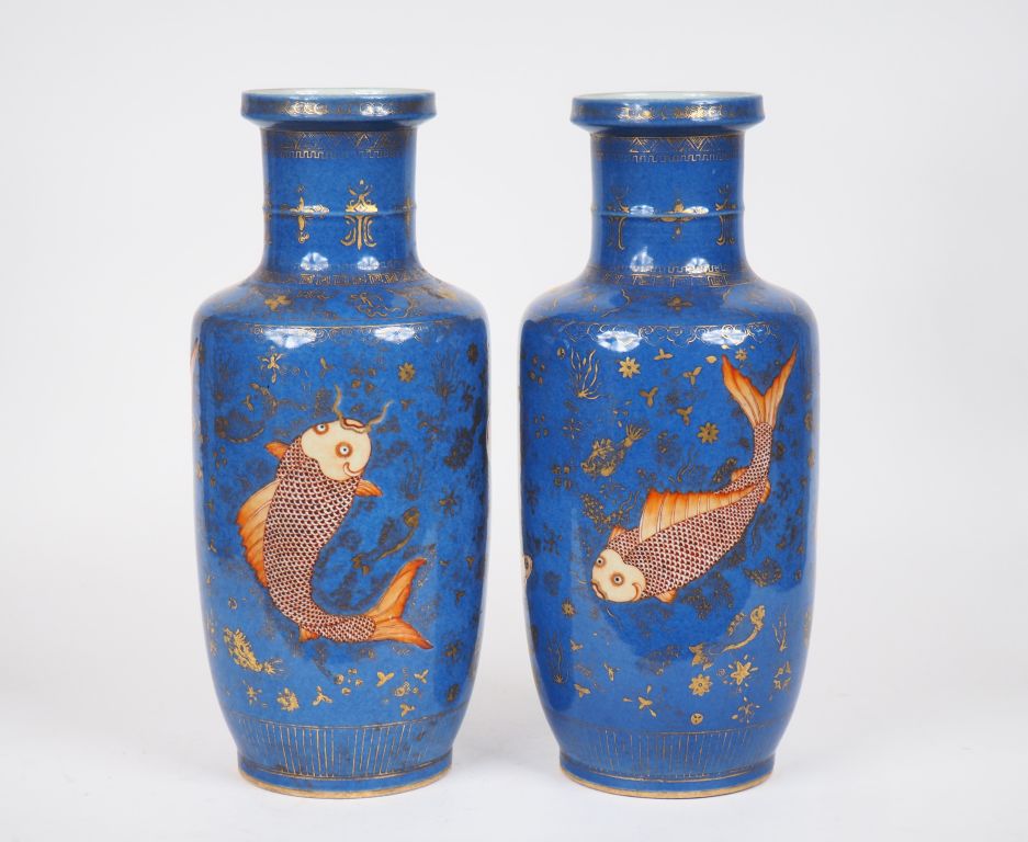 Chine vers 1900 Paire de vases de forme rouleau en porcelaine à décor de carpes en émail rouge de cuivre sur fond bleu poudré évoluant parmi des plantes aquatiques rehaussées d'or. H. 46 cm. Provenance : Maison Besaucele, rue Boulbonne Toulouse.