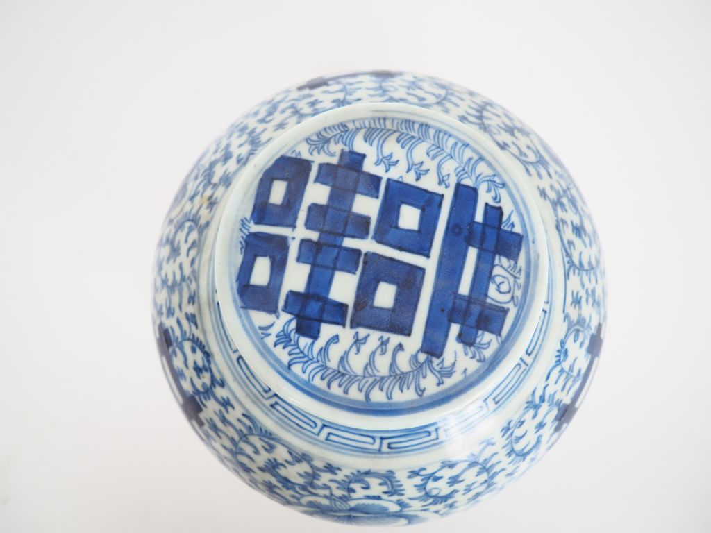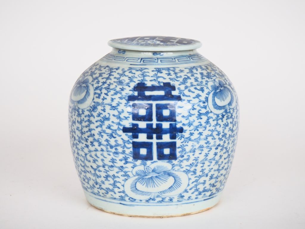 Chine, vers 1900, Pot à gingembre en porcelaine bleu blanc à décor de motifs de longévité sur fond de rinceaux feuillagés. Petite egrenure au col. H. 21 cm