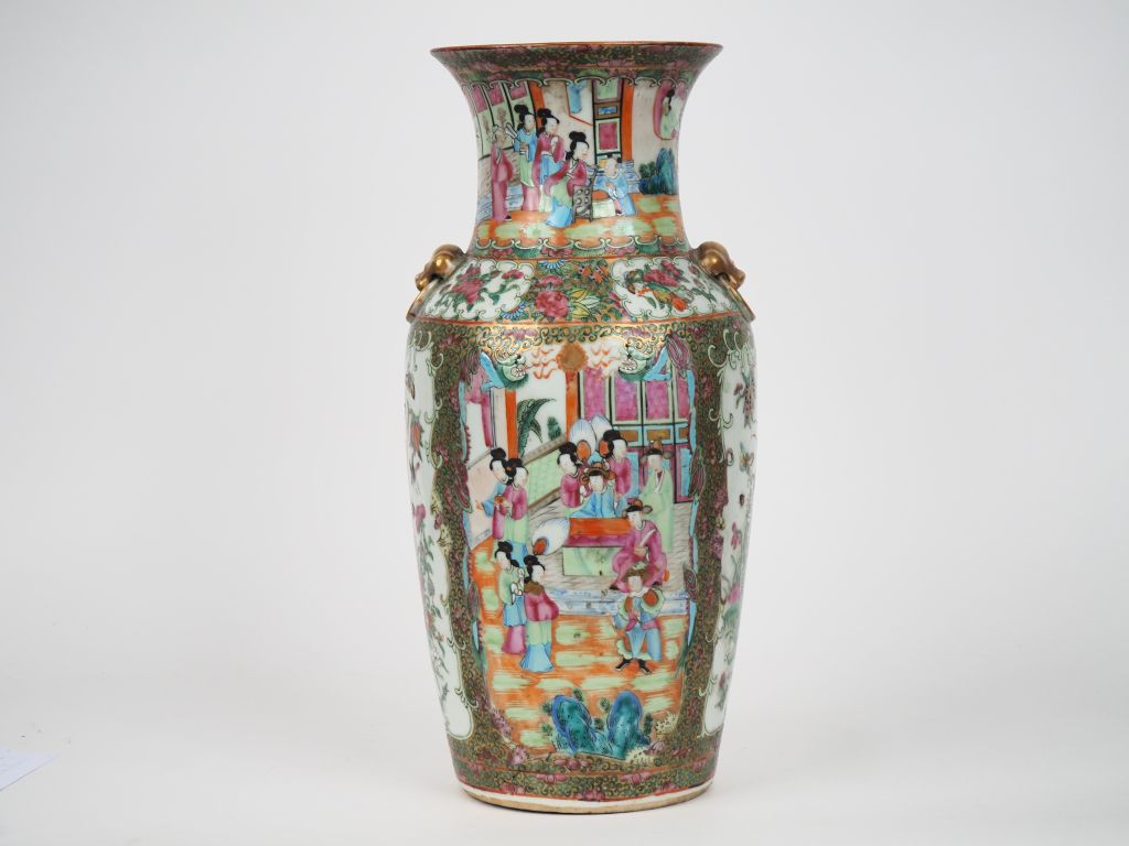 Chine vers 1900. Vase balustre en porcelaine famille rose, finemente décoré de médaillons de personnages, fleurs et végétaux. 2 têtes de lions complètent l'ornementation. H. 46 cm
