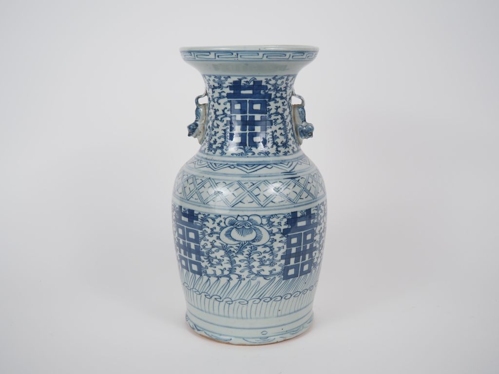 Chine, vers 1900 Vase de forme balustre en porcelaine bleu blanc, à décor du double bonheur, fleurs et rinceaux feuillagés, le col orné de deux lions en demi-relief. H. 33,5 cm