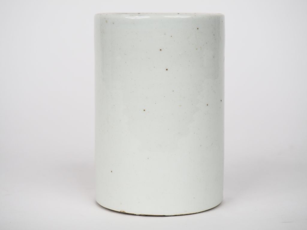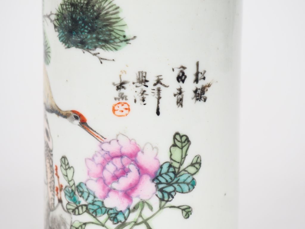 Chine, vers 1920 Bitong en porcelaine et émaux polychromes à décor d’une grue sous un pin de longévité becquetant une fleurs de pivoine, accompagnée d’un poème calligraphié. H. 11 x 7,5 cm