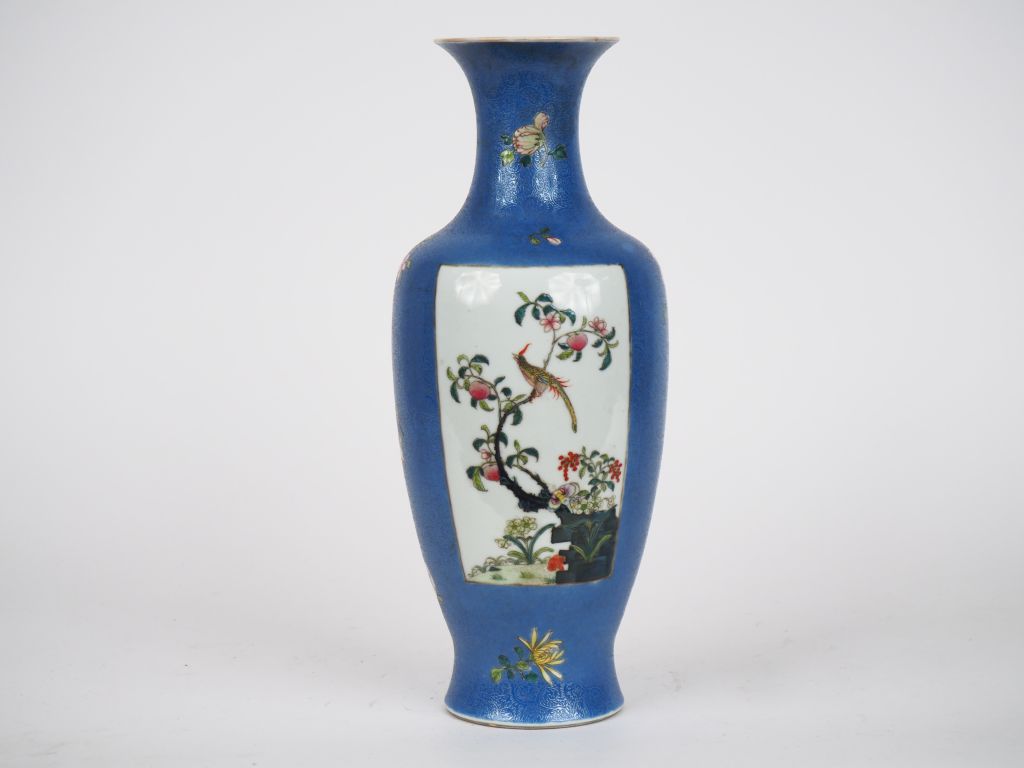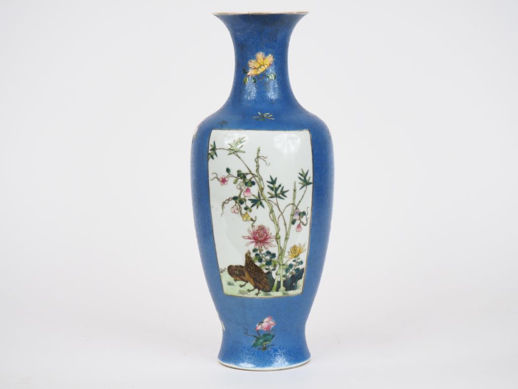 Chine vers 1920, Marque apochryphe Quianglong Vase balustre à panse décorée de rinceaux feuillagés en bleu, orné de 2 médaillons famille rose à décor de cailles et faisans parmis de arbustes et Bambou H. 34 cm. (Fel au col)