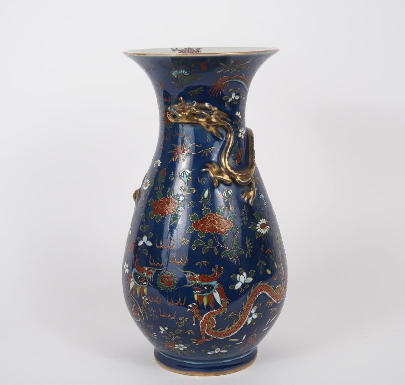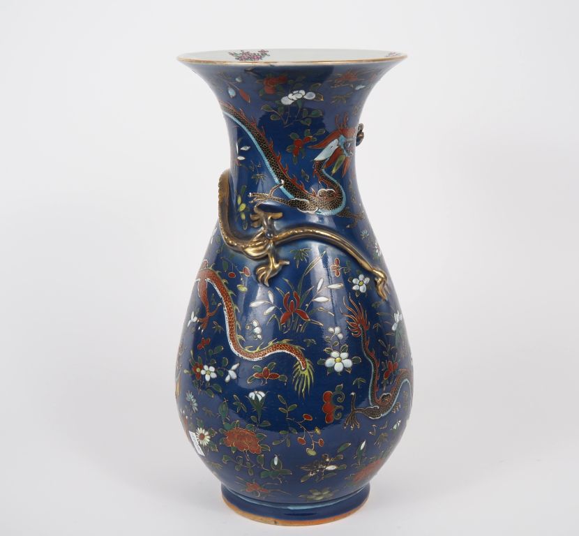Chine, vers 1920 Vase de forme balustre en porcelaine à décor polychrome sur fond bleu nuit de dragons poursuivant la perle sacrée et diverses compositions florales. Un dragon lové en demi-relief orne la base du col. H. 36 cm