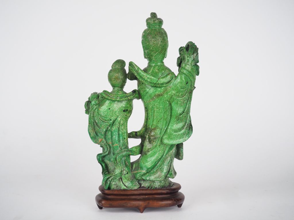 Chine, vers 1950, Groupe en malachite figurant deux déesses du printemps présentant des offrandes. H. 24 cm