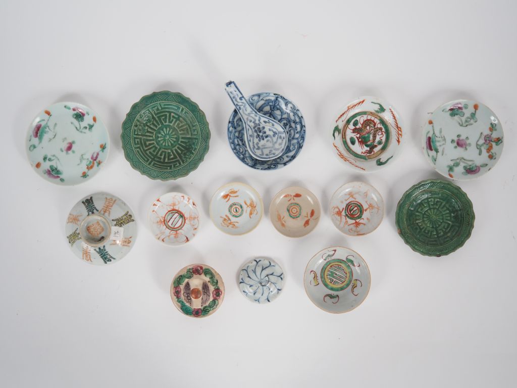 Chine, XIXe siècle, Ensemble comprenant 15 porcelaines, dont coupes creuses, assiettes, couvercles, cuillère en porcelaine bleu blanc, famille rose…à décor divers de fleurs, chauves-souris, rinceaux feuillagés, motifs shou… Usures. Dim. diverses.