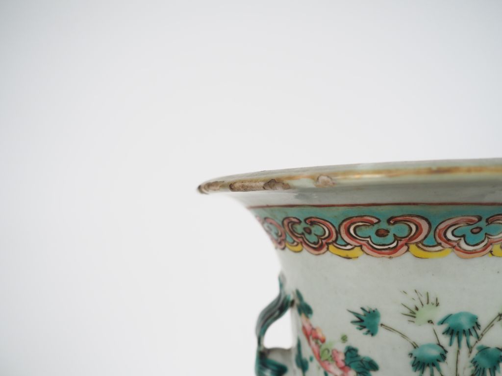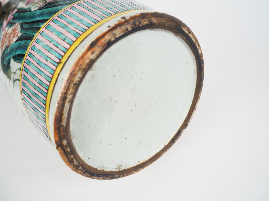 Chine, XIXe siècle, Important vase balustre en porcelaine et émaux de style famille rose à décor de coqs perchés sur un rocher entourés de prunus et pivoiniers en fleurs. Quatre lions bouddhiques en relief ornent la base du col. Fêls H. 63,5 cm