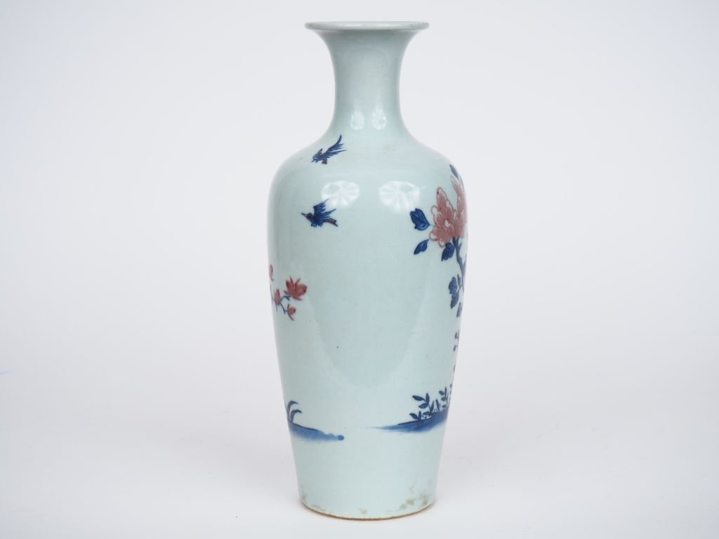 Chine XIXe siècle, Vase balustre à col évasé, en porcelaine émaillée bleu blanc et rouge de cuivre, d’un oiseau parmi des arbustes en fleurs. Marque apocryphe Kangxi en kaishu à quatre caractères sous la base H. 29 ,5 cm