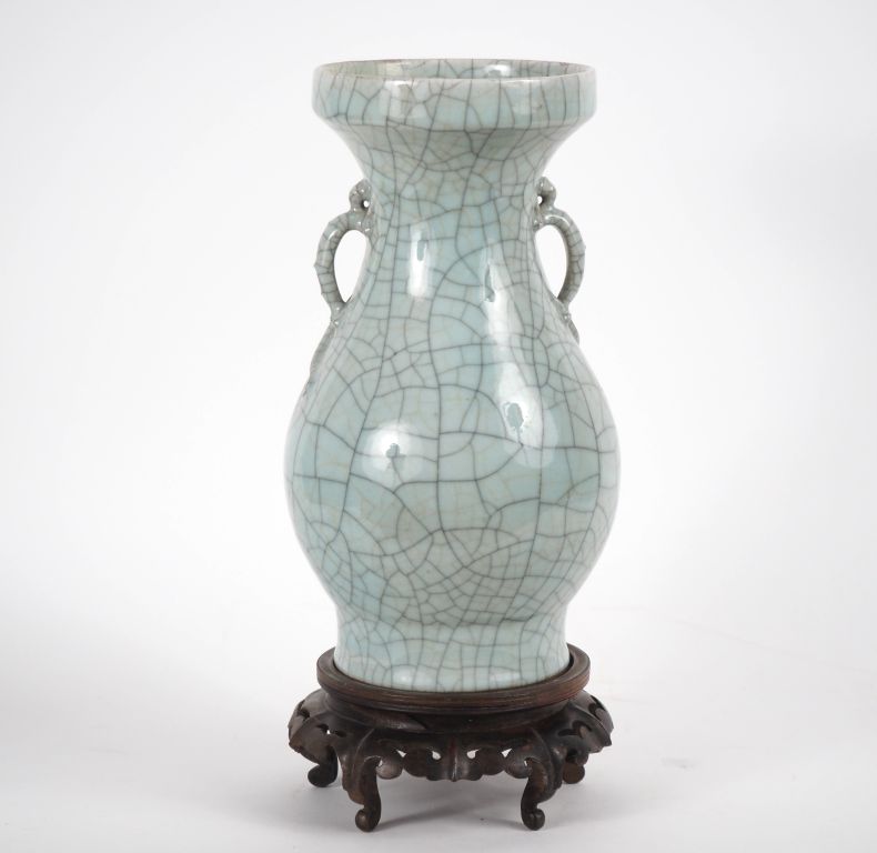 Chine, XIXe siècle Vase Hu en porcelaine et émail craquelé céladon de type Ge, la base du col orné de deux dragons formant anses. H. 34 cm (Restauration au col)