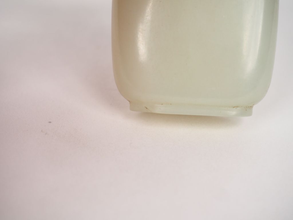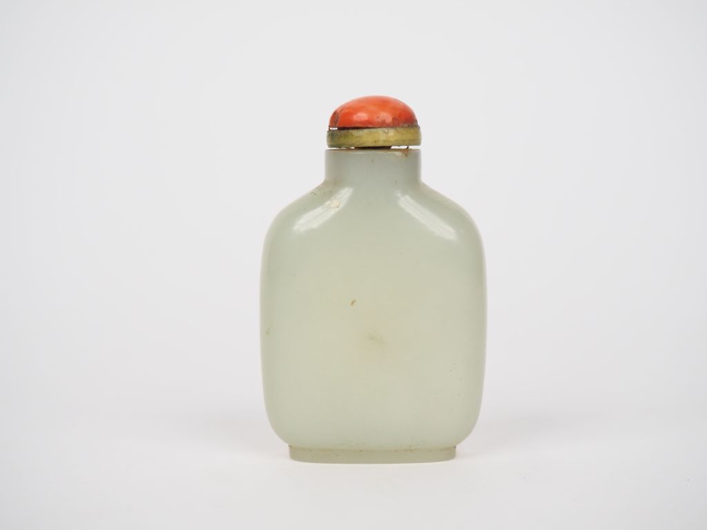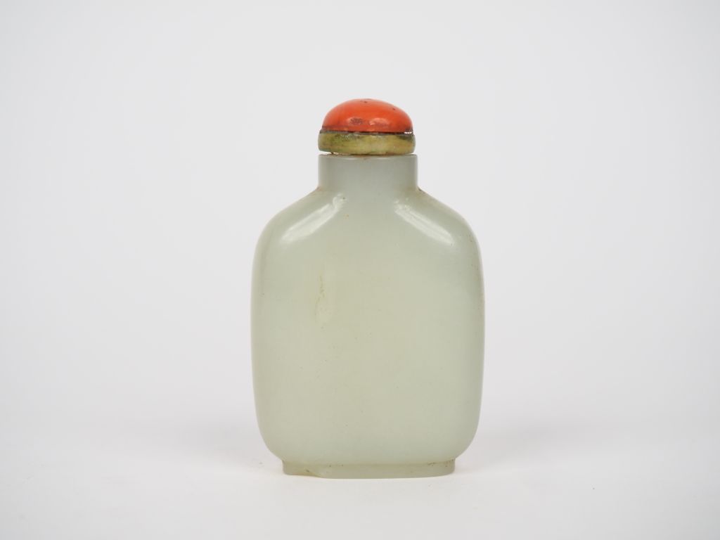 Chine XIXème. Flacon tabatière en jade céladon recouvert d'un bouchon en corail. H. 5,7 cm. (Petite déformation au talon).