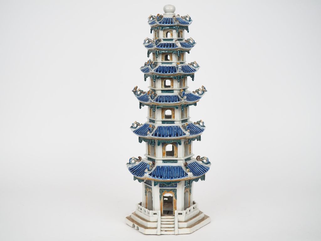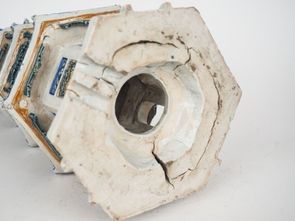 Chine XIXème siècle, Pagode à cinq étages en biscuit émaillé, céladon, beige et bleu H. 47 cm, Accidents et manques
