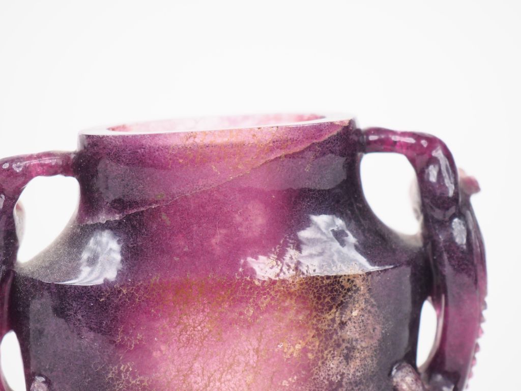 Chine XIXème. Vase balustre en fluor améthysé flanqué de deux dragons, couvercle zoomorphe (petit éclat au couvercle) on y joint une boite couverte en cornaline en forme de canard (petits éclats aux pattes) H. 12,5 et 8,5 cm