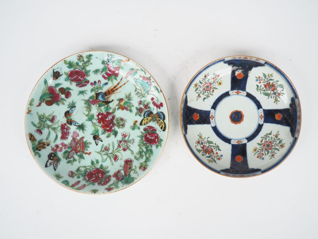 Chine, XVIIIe siècle, Deux assiiettes en porcelaine l'une à décor "imari chinois", l'autre en porcelaine de Canton. D. 20,5 er 24,5 cm