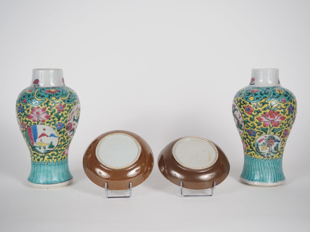 Chine, XVIIIe siècle Lot comprenant une paire de potiches en porcelaine et émaux de la famille rose, à décor en médaillons de dragons, fleurs, rinceaux , une paire de coupes en porcelaine et émaux de la famille rose sur fond capuçin, à décor d’oiseaux et fleurs. H. 22,5 cm – Diam. 13 cm (Cols restaurés aux vases – petit éclat à une coupe, fel)