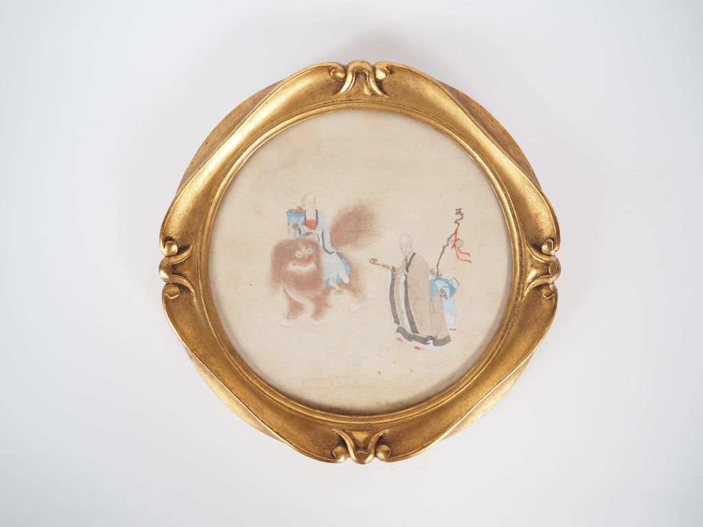 Chine, XVIIIe siècle Peinture en médaillon circulaire, encre et couleurs sur soie, représentant un dignitaire présentant un sceptre ruyi à l’un des 18 lohans chevauchant un lion bouddhique. Diam. 24 cm