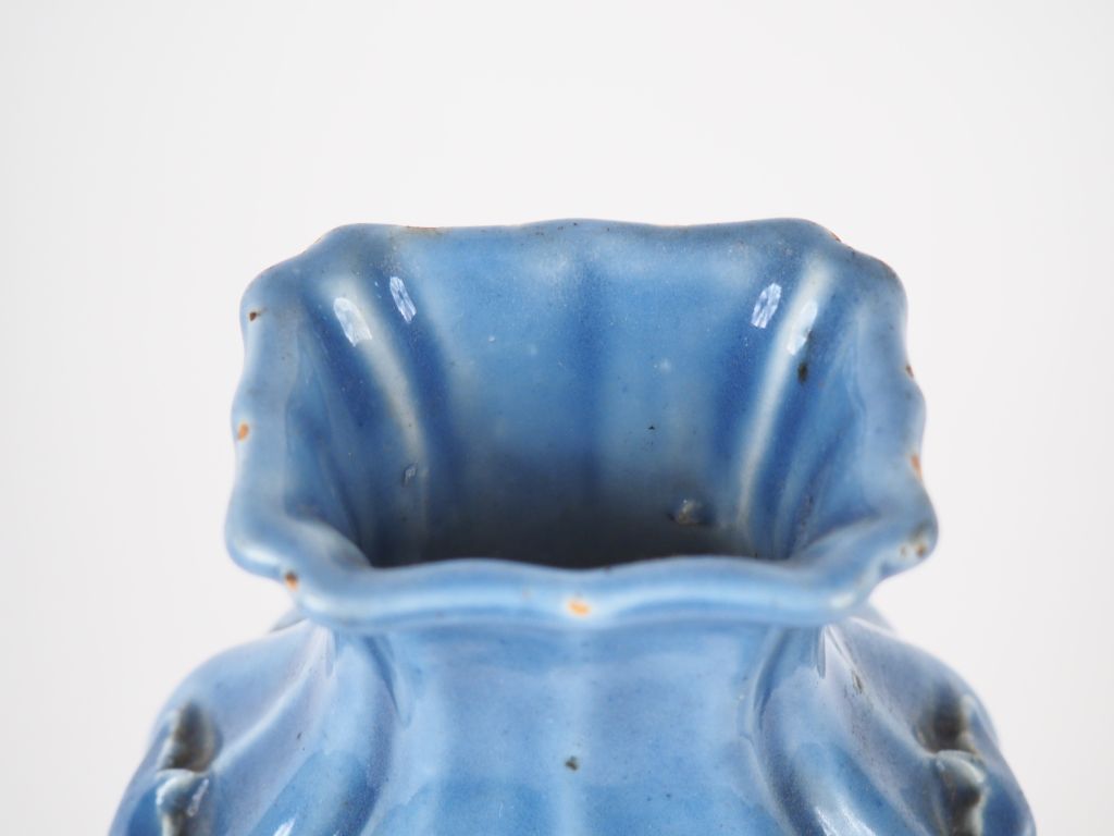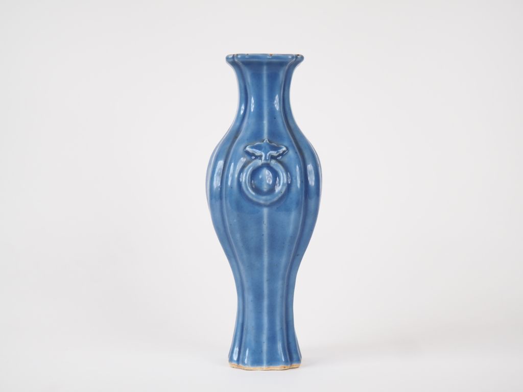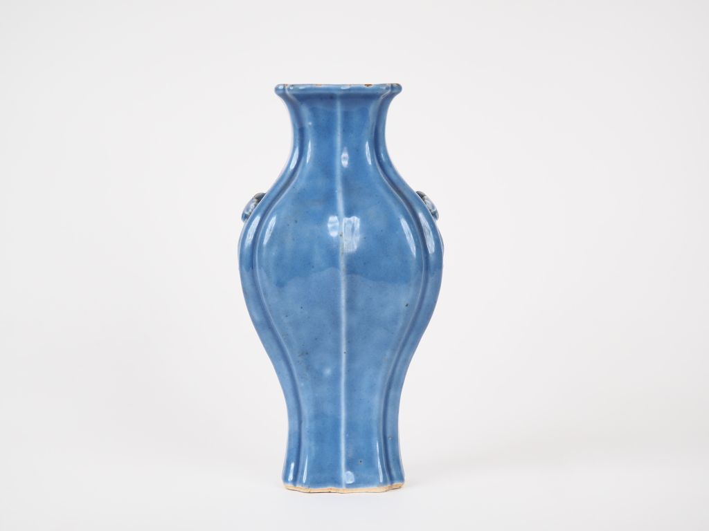 Chine, XVIIIe siècle, Vase quadrangulaire à panse godronnée en porcelaine émaillée bleu lavande orné de deux anses représentant des papillons et des anneaux. H. 22,5 cm (quelques sauts d'émail, un fel de cuisson).