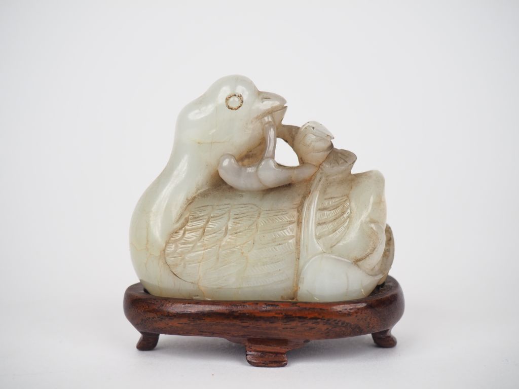 Chine XVIIIème. Petit pendentif en jade blanc figurant un canard la tête tournée tenant une grande fleur de lotus. Dim. 5,3 cm