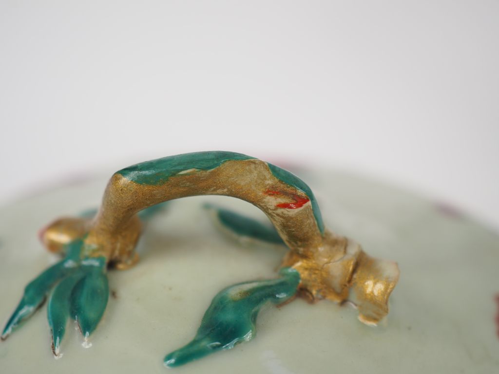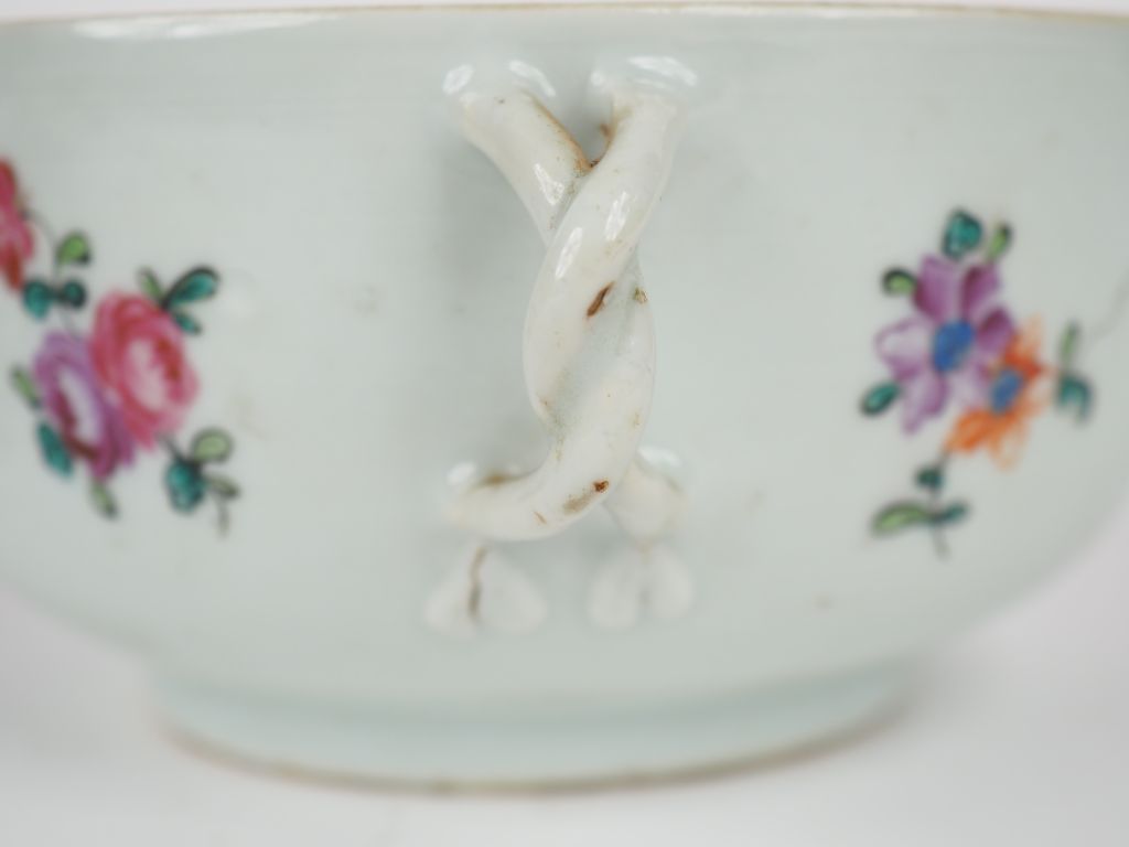 Chine XVIIIème siècle. Paire de bouillons couverts en porcelaine émaux de la famille rose, anses torsadées. L. 17 cm. (restaurations sur les anses)
