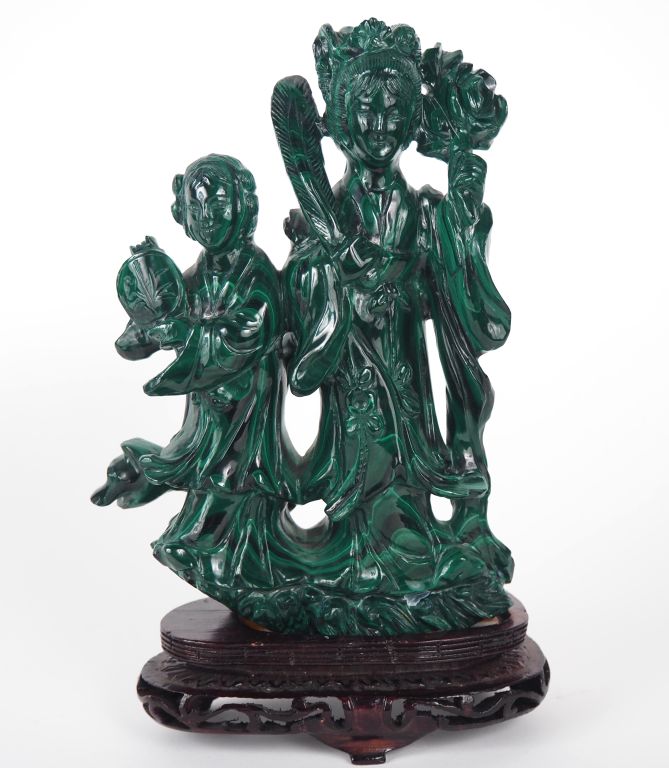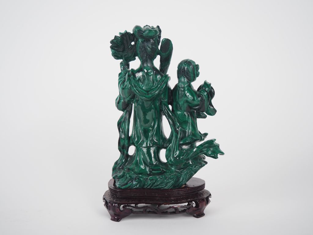 Chine, XXe siècle Groupe en malachite, représentant une déesse du printemps et sa servante. H. 17 cm