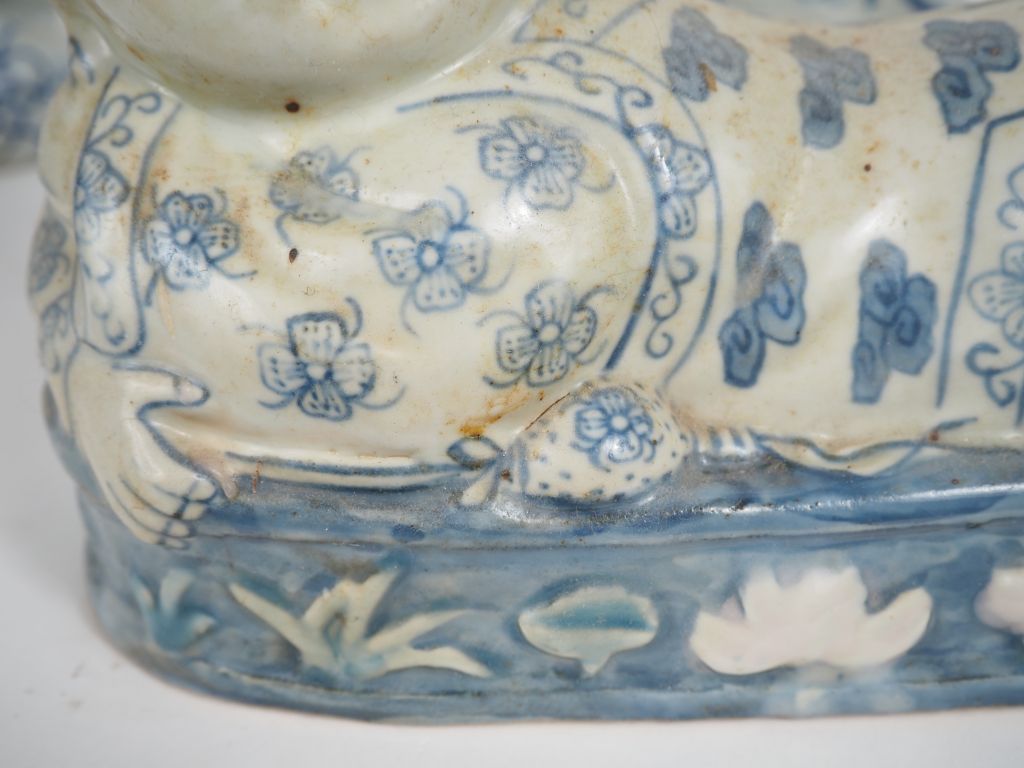 Chine, XXe siècle, Trois oreillers, en porcelaine bleu blanc, représentant des enfants. Dim. 14,5 x 24 cm