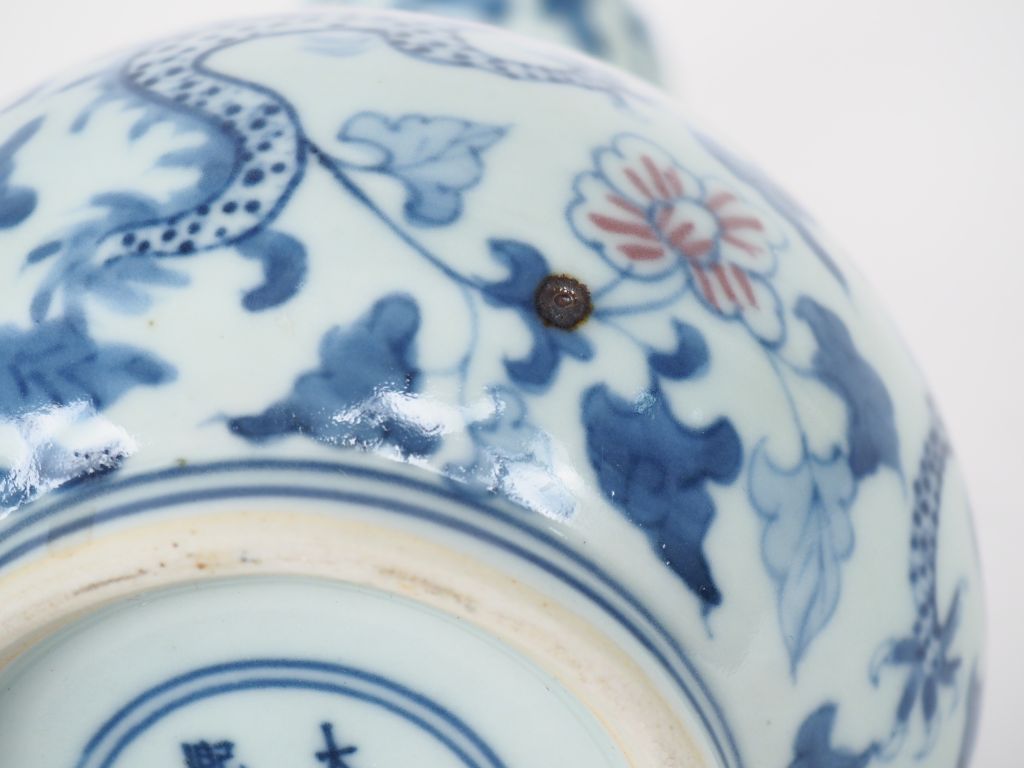 Chine, XXe siècle, Vase bulbe, en porcelaine bleu blanc et rouge de cuivre, d’un dragon à cinq griffes évoluant autour de fleurs de pivoines. Le col orné de feuilles de bananiers. Marque apocryphe Kangxi H. 23 cm