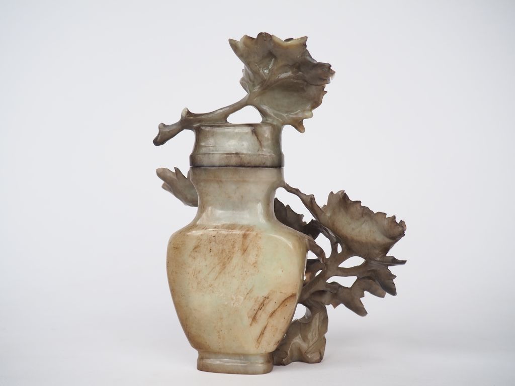 Chine, XXe siècle, Vase couvert en serpentine sculpté d'un pivoinier en fleurs. H. 20 cm (égrenure)