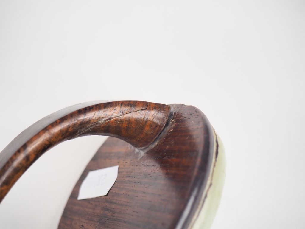 Chine XXe siècle vers 1920. Sceptre ruyi en bois incrusté de trois plaques en jade céladon (à décor de peche de longévité, d'un citron de digité dit main de bouddha et de grenade). L. 26 cm (recollé)