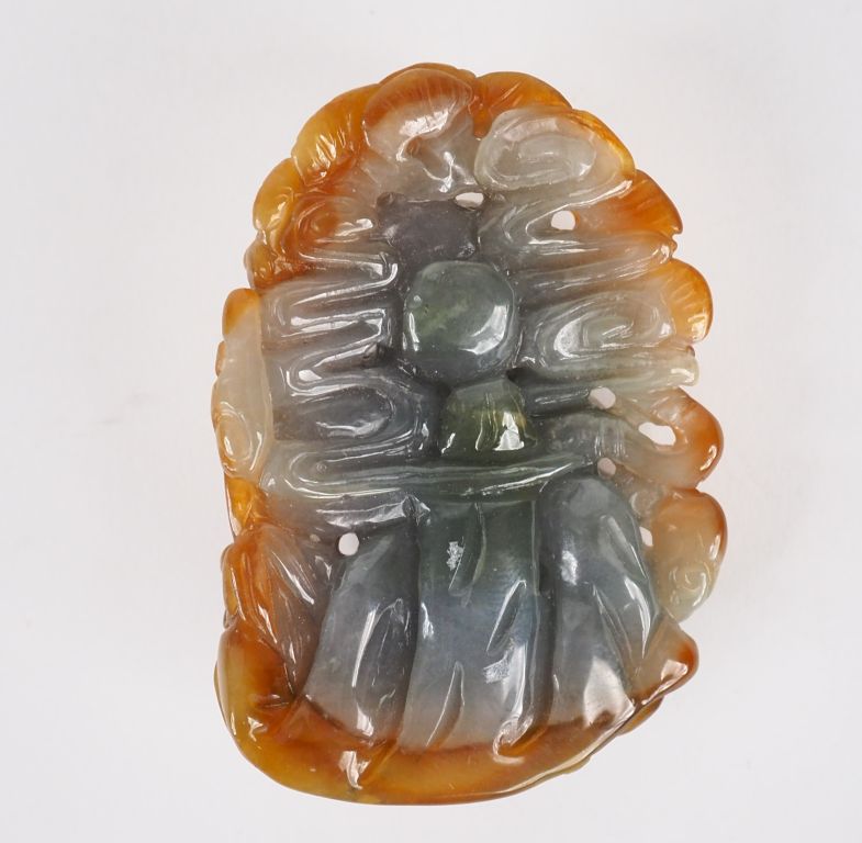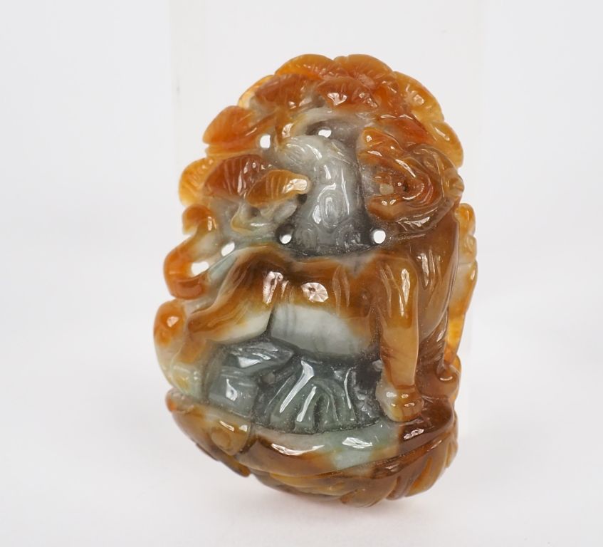 Chine XXème. Pendentif en jadéite de couleur céladon infusée de rouille représentant un tigre sous un pin de longévité. H. 5,6 cm.
