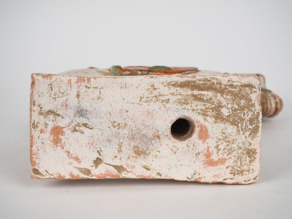 Chine XXème siècle. Statuette figurant un cheval arnaché en terre cuite émaillée. H. 29 cm (tête du cheval recollée).