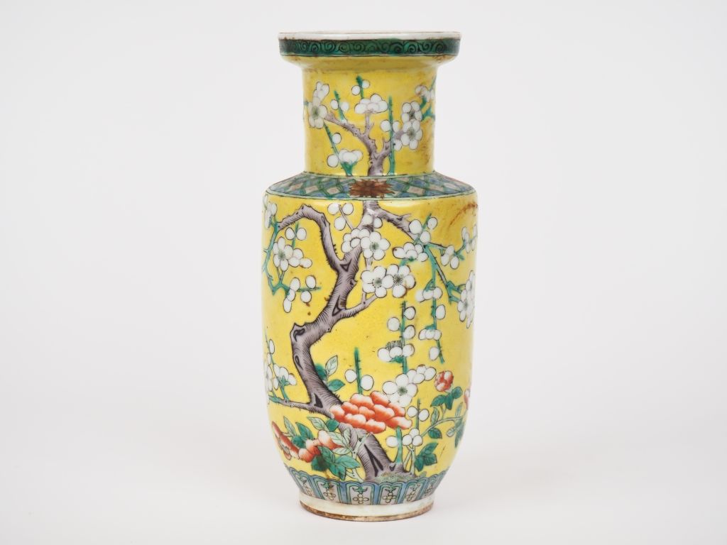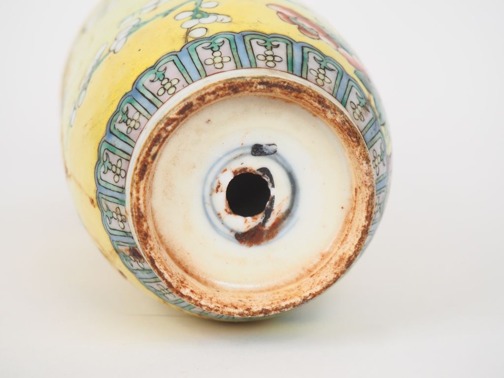 Chine, XXème siècle, Vase balustre en porcelaine émaillée jaune, à décor de prunus en fleurs survolés de papillons. Fond percé H. 25 cm