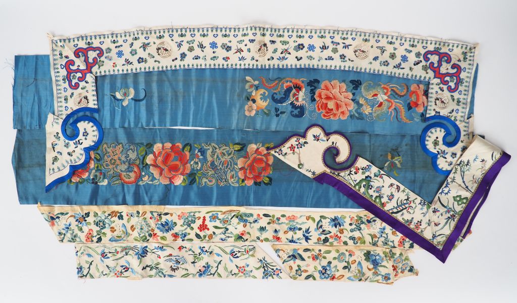 Chûtes et bandes en soie sur fond bleu et crème à décor de papillons, de fleurs et d'oiseaux (tâches ).