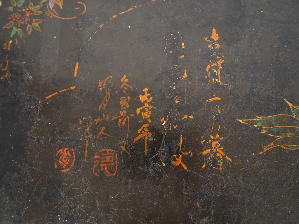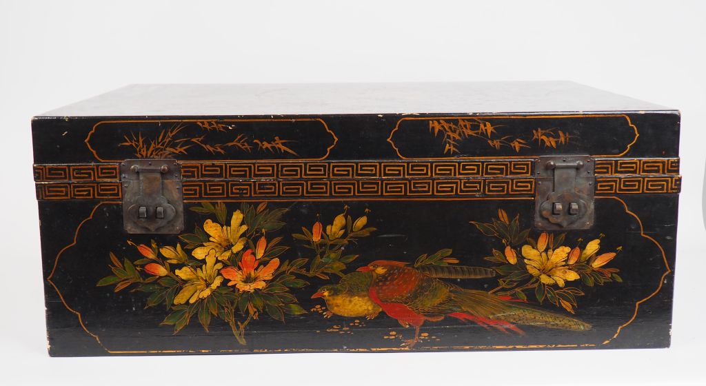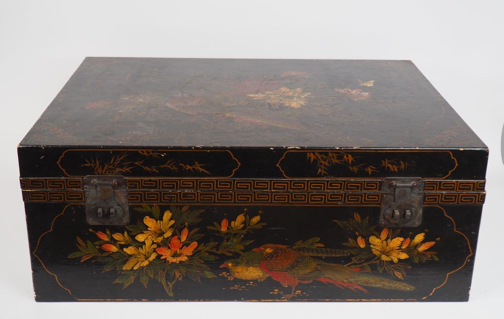 Coffre à abattant en bois laqué, à décor de faisans branchés sur un pivoinier en fleurs. Chine du Sud, vers 1900. 29 x 76 x 56 cm (décor un peu effacé)