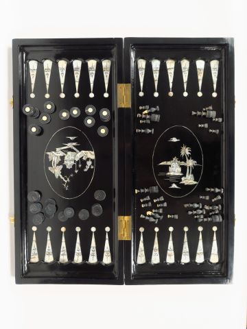 Coffret à jeux en bois laqué et nacre contenant damier, jeu d'échec et jeu de jacquet (incomplet). 63 x 29 cm