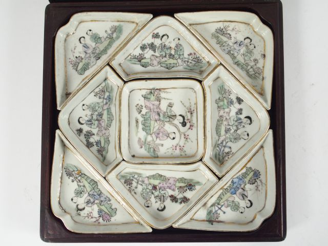 Coffret en bois et verre émaillé contenant neuf raviers à friandises en porcelaine et émaux de la famille rose, à décor de jeunes femmes et d'enfants. Chine, période Guangxu. 27 x 27 cm