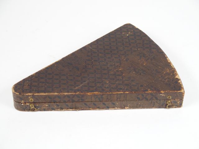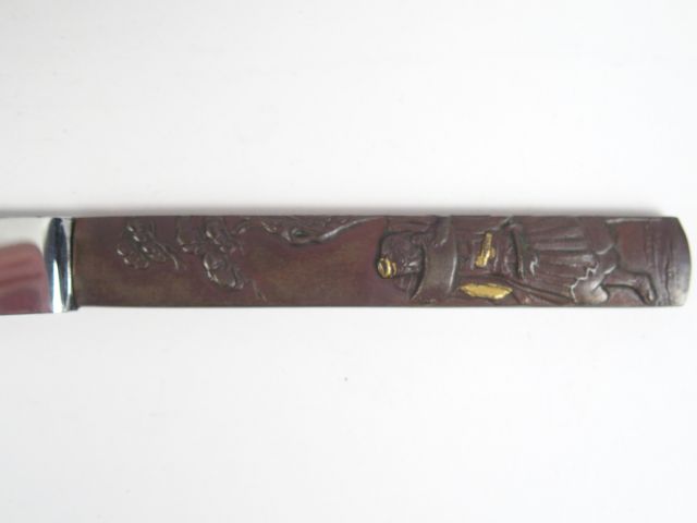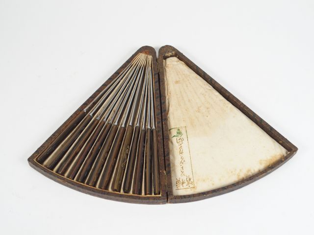 Coffret en forme d'eventail contenant 12 couteaux formés par des manches de Kozuka, décor de personnages légendaires, oiseaux, fleurs et végétaux. Japon, 1900.