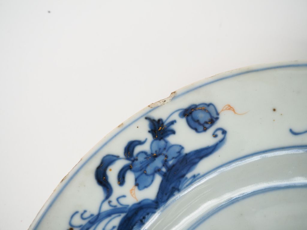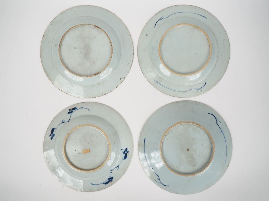 Compagnie des Indes, "Imari chinois" XVIIIe siècle, Lot comprenant quatre assiettes en porcelaine bleu blanc, corail et rehauts d’or à décor de fleurs. D. 22 et 23 cm Egrenures et petits éclats.