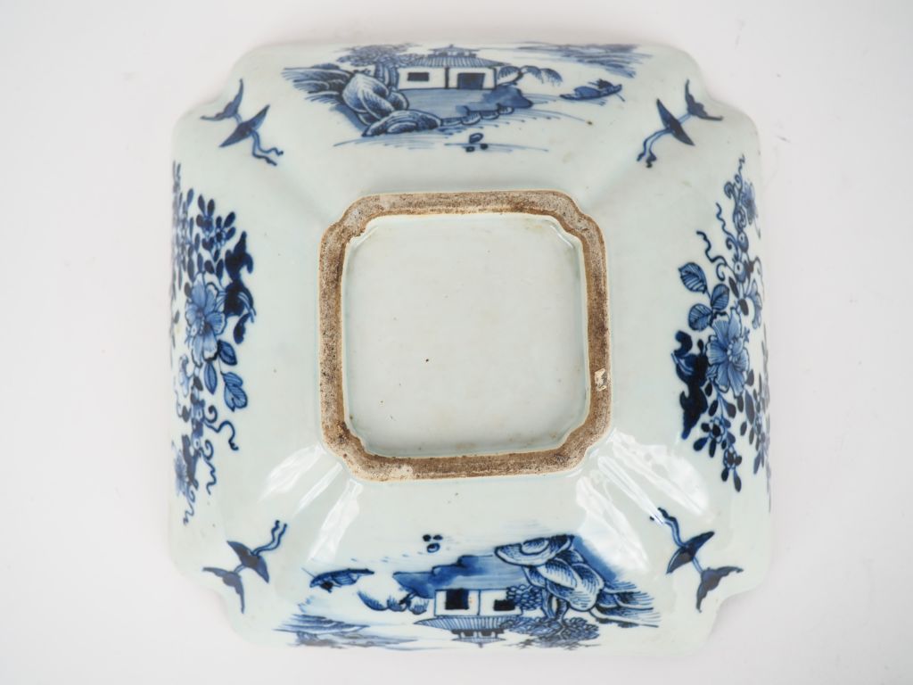 Compagnie des Indes, XVIIIe siècle, Jatte quadrangulaire en porcelaine blanche à décor en bleu sous couverte de compositions florales. Petites egrenures Dim. 7 x 22 x 22,5 cm 150/200 €