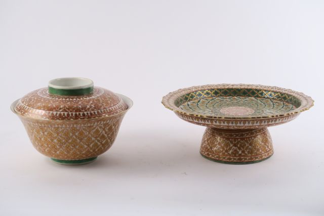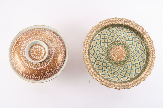 Coupe couverte et un présentoir en porcelaine de Chine XIXème, en rouge de fer réalisés pour le Siam (Bancharong) (fels, petit éclat)