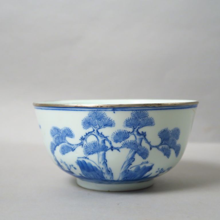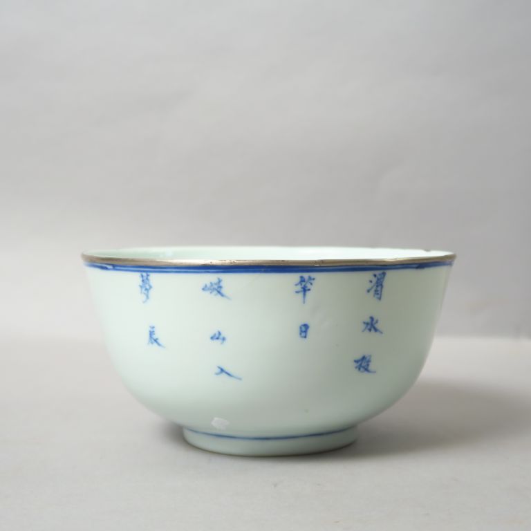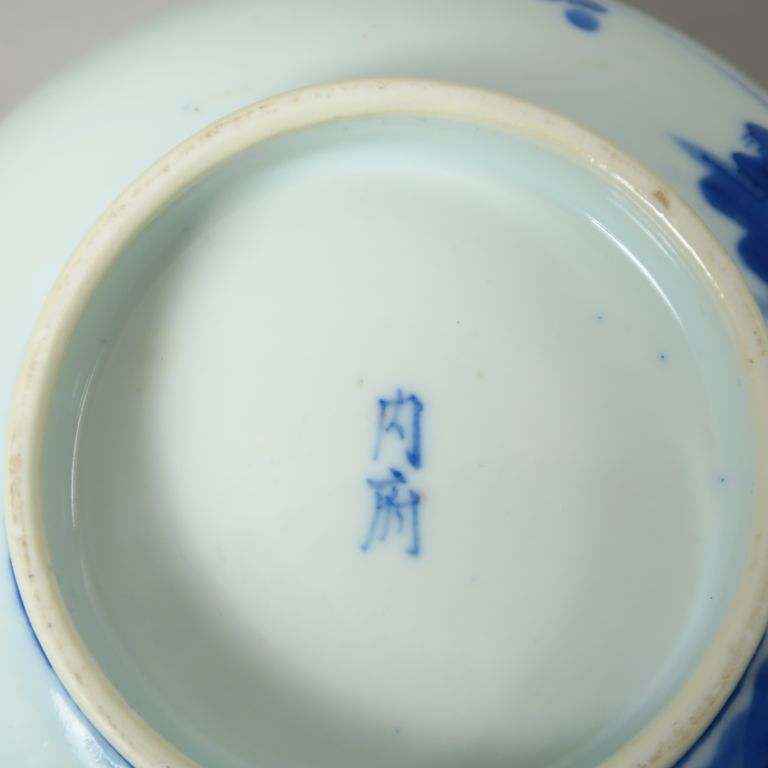Coupe en bleu de Hué, à décor de pêcheur au bord d’un lac. Marque Neifu sur la base. Vietnam, vers1900. Diam. 17 cm (Petit éclat)